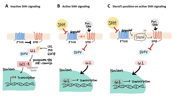 두 물질을 콜레스테롤로 대체하고자 한 근거는 SHH signaling pathway였으며, 선행연구를 바탕으로 연구팀이 그린 그림은 다음과 같다. SHH signaling pathway는 hiPSCs가 mDA 뉴런으로 분화되는 과정 중 중요하게 작용하는 경로 중 하나로, Gli1 mRNA의 전사와 관련되어 있다.