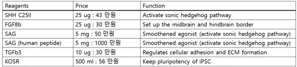 연구팀은 아래의 표에서 비용이 많이 드는 ▲SAG ▲SHH ▲FGF8b를 대체 대상 후보로 선정하였다.