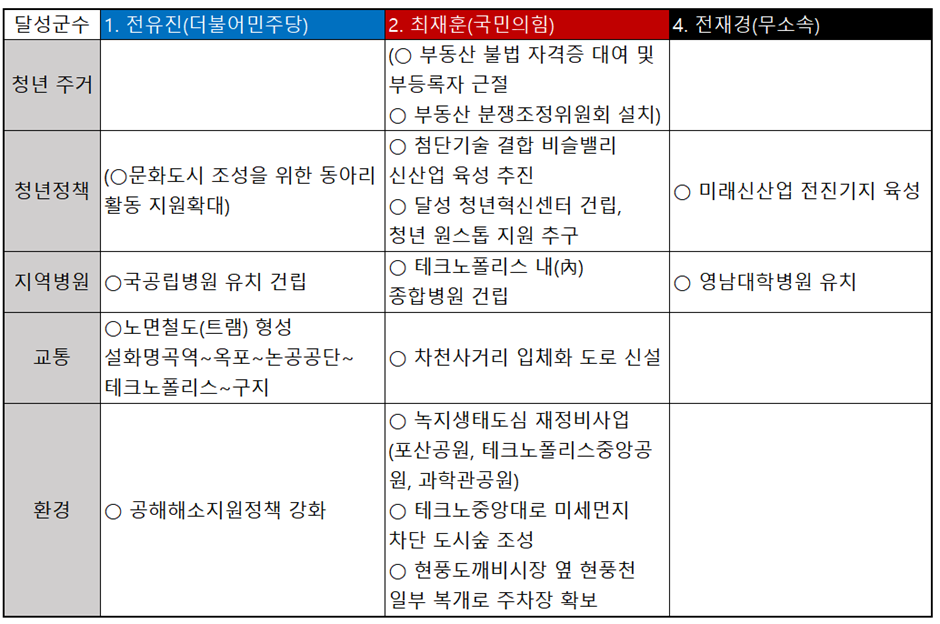 청년 정책 공약은 청년이 부각된 정책뿐 아니라 일자리 정책과 창업 정책을 고루 고려하여 선정하였다. 1번 전유진 후보는 청년 정책을 제시하지 않았지만, DGIST 학생들에게 가까운 공약으로 문화도시조성을 위한 동아리활동 지원확대가 있다.