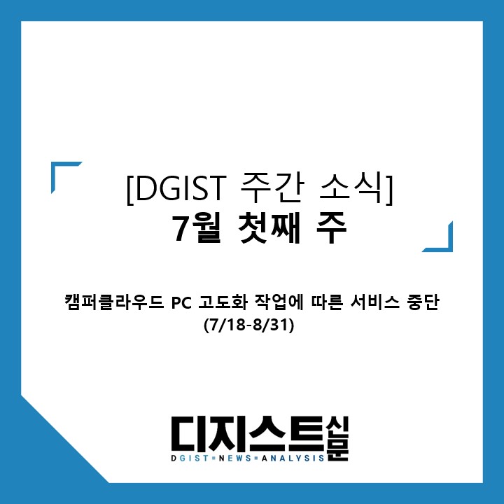 정보전산팀은 7월18일부터 8월 31일까지 ‘DGIST 캠퍼스클라우드시스템’ 업그레이드 작업을 진행한다. 해당 기간동안 클라우드 PC 서비스가 중단되며, 작업 과정에서 클라우드 PC에 저장된 데이터가 삭제될 예정이다. 해당 시스템을 이용하는 구성원은 2022년 7월 17일까지 사용자 데이터를 백업해야 한다.