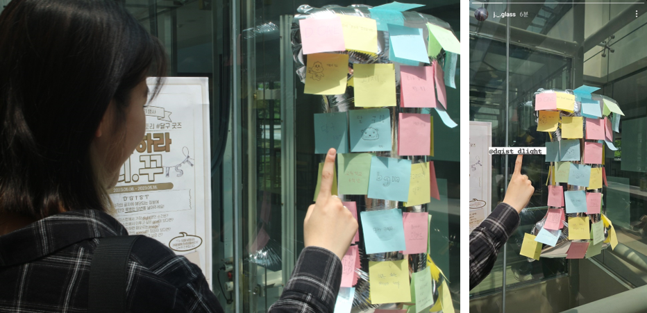 DGIST 학생 홍보대사 D.light가 지난 8일부터 오는 14일까지 E7 해동창의마루 앞 인포데스크에서 디지스트 글자 꾸미기 행사(이하 디.꾸)를 진행한다. 하루마다 D.light가 준비한 서로 다른 질문의 답을 포스트잇에 적어 DGIST 각각의 글자를 꾸미고, 이를 해동창의마루에 전시하는 형태이다. 각 질문의 주제는 ▲디지스트에서 가장 dlight했던 순간은? (8일) ▲디지스트에서 이루고 싶은 goal이 있다면? (9일) ▲디지스트 하면 떠오르는 image? (10일) ▲디지스트만의 special한 장점이 있다면? (11일) ▲디지스트에서 꼭 try 하고 싶은 건? (12일, 14일)이다.