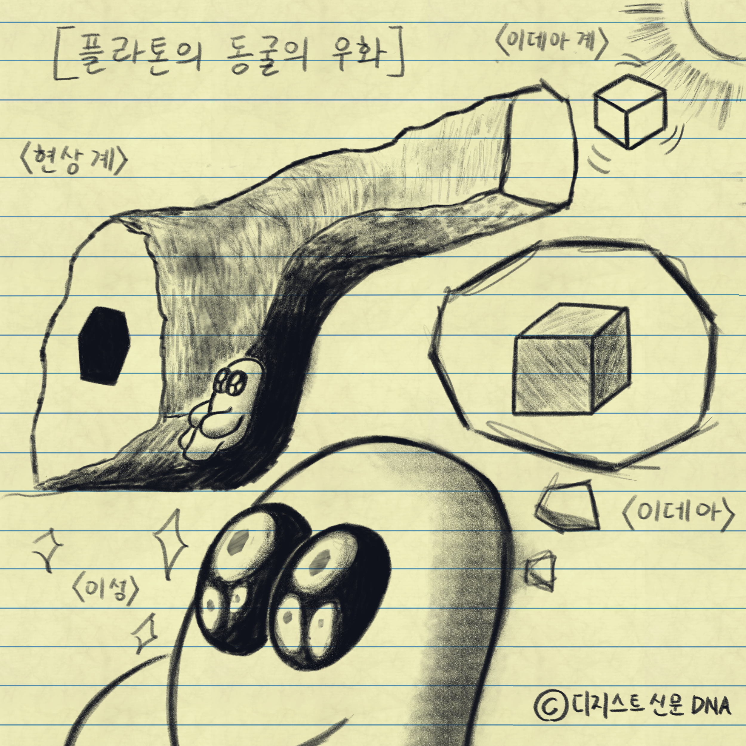 동굴의 우화에서, 인간은 탈출할 수 없는 동굴에 갇힌 존재로 묘사된다. 인간의 눈앞에는 동굴 밖 세상의 물체와 빛에서 비롯된 그림자가 동굴 벽에 펼쳐진다. 직접 볼 수 있는 것은 그림자뿐이지만, 인간은 그림자의 근원인 동굴 밖의 물체를 이성을 이용해 상상할 수 있다. 예를 들어 그림자가 정사각형에서 육각형의 모양으로 점점 변하는 규칙성을 발견한다면, 동굴 밖에 정육면체가 있음을 꿰뚫어 볼 수 있을 것이다. 플라톤은 동굴의 우화에서 동굴 밖을 이데아계, 동굴 내부를 현상계, 동굴 밖을 상상할 수 있는 지성을 이성으로 비유했다. 우리가 현상계에서 감각으로 경험할 수 있는 건 불완전한 이데아의 복제품뿐이지만, 이성을 사용하면 현상 넘어 이데아를 볼 수 있다는 이데아론이 플라톤의 주된 사상이다. 예를 들어 세상에 있는 고양이들은 크기도, 모양도, 생김새도 모두 다르지만, 고양이라는 개념의 궁극체인 고양이 이데아를 생각할 수 있다는 식이다.