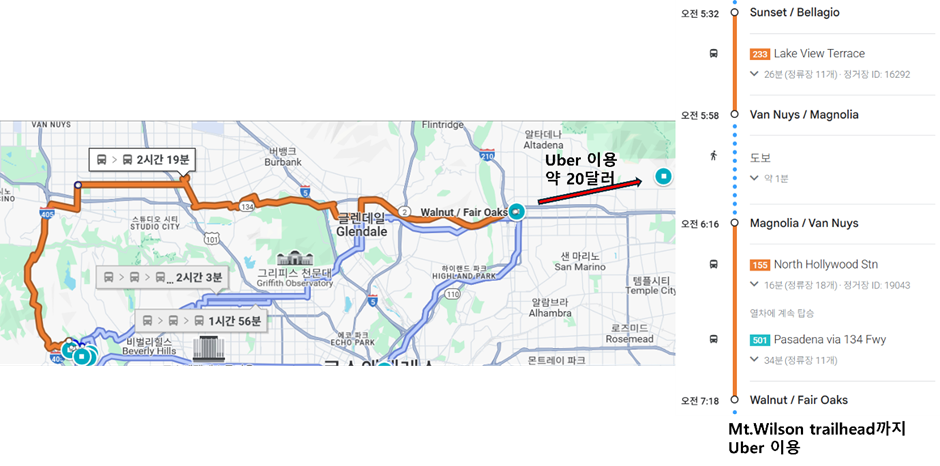 그러나 FGLP 도중 윌슨산 천문대 방문은 현실적으로 많은 어려움이 존재한다. LA에 있는 대부분의 관광지가 그렇듯 자가용이 없으면 시간적, 경제적으로 방문 난도가 매우 올라간다. 특히 윌슨산 천문대는 천문대가 위치한 정상까지 연결된 도로가 있기는 하지만 우버나 택시로는 접근이 불가능하기 때문에 방문하기가 더 어렵다. 어떤 택시 기사가 1700m가 넘는 산 정상까지 운행하려고 하겠는가. 결국 내게 남은 선택지는 현실적으로 단 하나, 도보로 방문하는 방법이었다. 말이 도보지 실제로는 등산이다. LA 시내에서 시작해서 윌슨산 정상까지 연결된 등산로는 딱 두 곳밖에 없는데, 그중 더 쉬운 코스는 우버를 타고 산을 조금이라도 올라가서 등산을 시작할 수 있는 챈트리 플랫 파킹 롯 앤드 트레일헤드(Chantry Flat Parking Lot and Trailhead)이다. 그러나 24년 여름에는 산불로 인한 보수 공사로 인해 진입이 불가능했기에(최근 재개장하여 현재는 이용 가능하다는 구글 리뷰가 있다) 어쩔 수 없이 좀 더 길고 힘든 코스인 마운틴 윌슨 트레일헤드(Mt. Wilson Trailhead) 코스를 타게 되었다.