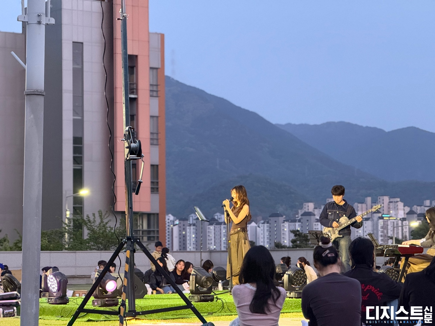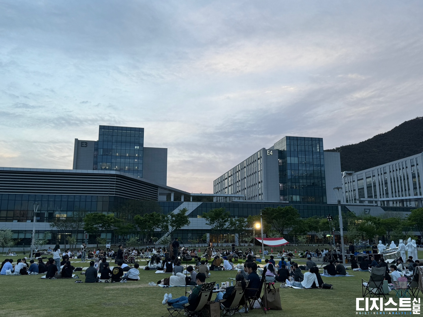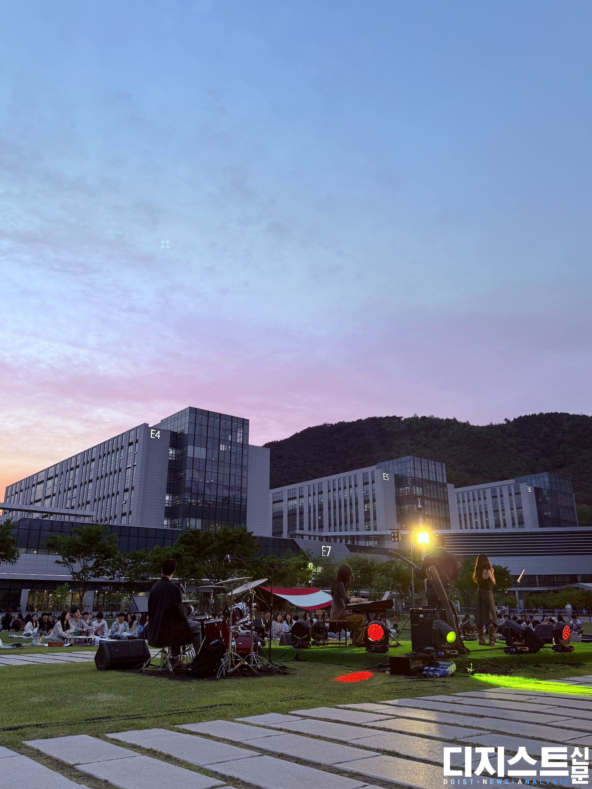 E7건물 뒤쪽으로 보이는 노을 빛과 함께 어우러지는 밴드의 연주와 보컬의 노래는 학업과 근무에 지친 구성원들의 마음에 안식을 제공하기 충분했다. 가끔 있는 소소한 행사들이 DGIST 대학 생활에 낭만을 가져오기를 기대한다.