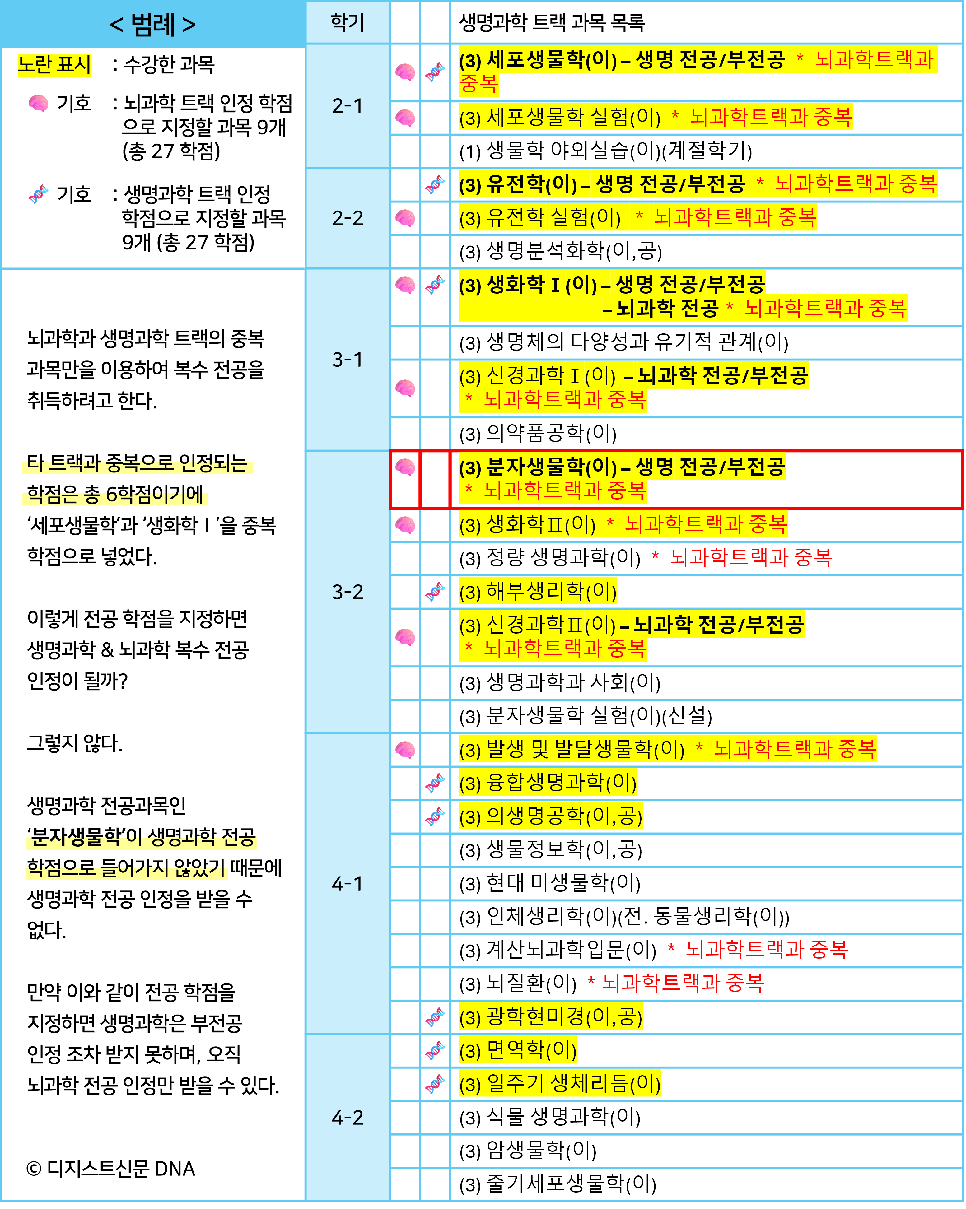 사례를 통해 조건들이 어떻게 적용되는지 확인해 보자. 어떤 학생이 위와 같이 생명과학 트랙 과목으로 48학점을 수강했다면 생명과학 & 뇌과학 복수 전공이 가능할까? 수강한 과목 중 뇌과학 트랙과 중복되는 과목 27학점을 뇌과학 트랙 학점으로, ‘세포생물학’과 ‘생화학Ⅰ’을 중복 학점으로 지정한다. 나머지 학점은 생명과학 트랙으로 지정한다. 이렇게 하면 양쪽 트랙 모두 27학점을 만족한다.