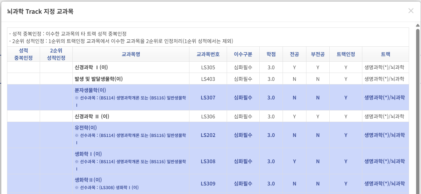 생명과학과 뇌과학 트랙의 복수 전공 혹은 부전공을 계획 중이라면, 전공 필수 과목 이수 여부와 중복 학점 인정 조건들을 잘 확인하여 적절하게 남은 시간표를 짤 수 있기를 바란다.