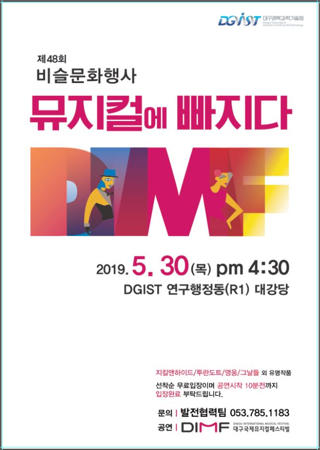 대구의 대표축제 ‘DIMF(Daegu International Musical Festival, 대구국제뮤지컬페스티벌)’가 뮤지컬 갈라쇼로 DGIST에 온다. 다가오는 5월 30일(목) 오후 4시 30분, 연구행정동(R1) 대강당에서 80분 동안 진행되는 이 공연은, 대구 외곽에 위치하여 문화생활을 즐기기 어려운 DGIST 구성원들에게 볼거리를 제공하기 위해 열린다.