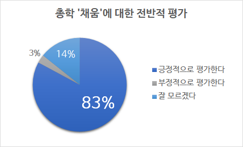총학생회 ‘채움’을 긍정적으로 평가한다는 의견은 82.9%로 높게 나타났다. (부정적으로 평가한다, 모르겠다는 답변은 각각 2.9%, 14.3% 였다) 학생들은 대체로 ▲ 만족스러운 공약 및 이행도 ▲ 학생들의 권익 증진을 위한 노력 ▲ 학생사회의 참여 유도 ▲ 빠른 일처리 및 응답 ▲ 학생, 교수, 총장과의 적극적인 소통 등에 대해 긍정적으로 평가했다.