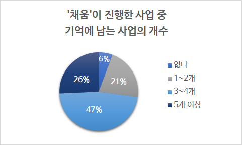 우선 1년간 진행한 사업 중 기억하는 사업이 몇 개인지 물었다. 설문 내용에서 사업명을 보고 기억하지 않도록 사업명을 별도로 안내하지 않았다. 3개~4개를 기억한다는 답변이 47.1%, 5개 이상이라고 답한 답변이 25.7%였다. 과반이 넘는 72.8%의 응답자가 3개 이상의 사업을 기억하고 있었다.