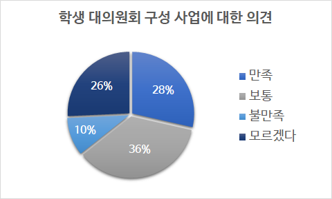 학생대의원회 구성 사업에 불만족한다는 응답이 10%로 모든 사업 중에 가장 높았다. 모르겠다는 응답도 25.7%로 높게 나타났다. 그에 대해서는 취지가 좋았다는 답변과 함께 학생 자치의 필요성에 대한 홍보 행동을 이끌어내기 위한 홍보가 부족했다는 답변을 들어볼 수 있었다.