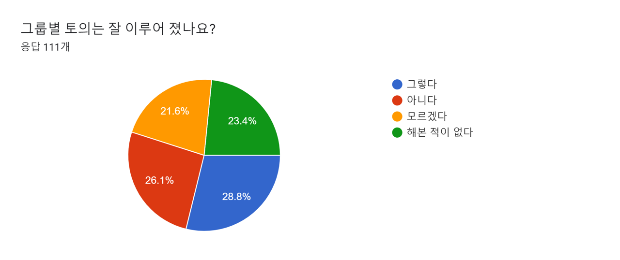 단, 질의응답에 대해서는 긍정적인 답이 조금 더 많았다. 대면강의를 시작하더라도 같은 방식의 질의응답 시스템을 도입하는 것도 고려해볼 만 하다.