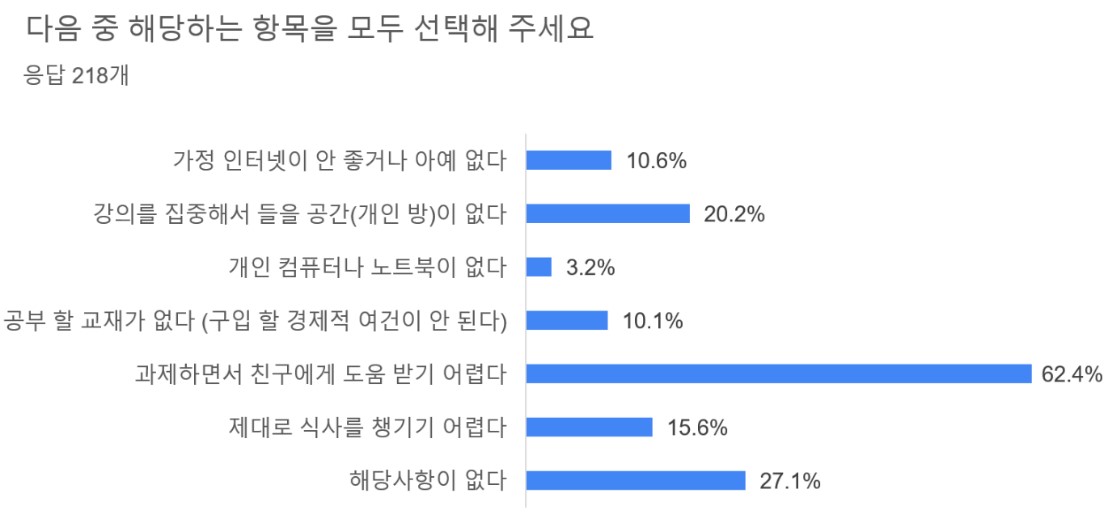 공부할 환경이 충분한지 알아보기 위한 문항에서, 과제 하면서 친구에게 물어보기 힘들다는 학생은 136명으로 전체 응답자의 62.4%에 이르렀다. 강의를 집중해서 들을 공간이 없어 힘들다는 학생도 20.2%로 적지 않았다.