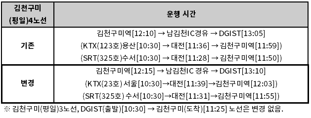KTX 및 SRT 기차 노선의 운행 시간이 변동되어, 기존 오후 12시 10분에 김천구미역에서 출발하던 평일 4노선 순환 셔틀버스가 5분 늦어진 15분에 출발하도록, 1월 7일부터 조정한다. 그 외 노선은 변동사항이 없다.