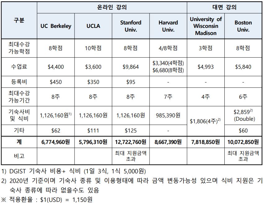 파견 학교가 보다 다양해진 만큼, 수강 기간 및 학점 역시 다양하다. 대학별로 3주에서 8주까지 다양한 기간과 이수 학점을 선택하여 신청할 수 있다. 또한, 해당 일정을 제외한 다른 기간의 여름 학기 역시 해당 학교에서 진행은 되지만, DGIST 학사일정을 고려해 파견 기간이 결정된 만큼 안내되는 기간의 여름 학기 과목만 이수가 가능하다.