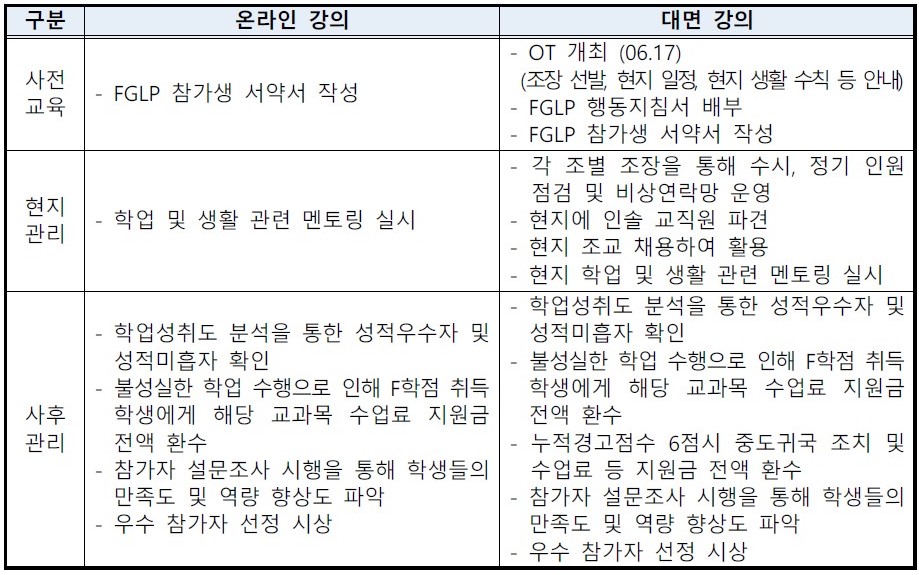 이를 비롯하여 FGLP에 참여하는 학생들에 대한 철저한 관리가 진행될 예정이다. 그 일환으로 서약서 작성 학업 성취도 분석 참가자 설문조사 등을 시행한다. 이외 주요 참가 학생 관리 방안은 아래 표와 같다.