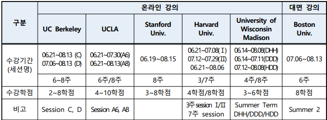 2021년 신입생글로벌리더십프로그램(FGLP)의 변경 사항이 공지되었다. University of Wisconsin Madison의 Summer Term HDD(07.12~08.06) 수업이 모두 온라인 수업으로 변경되어, 기존 대면강의로 신청이 가능했던 University of Wisconsin Madison이 온라인 강의 신청 대학으로 변경되었다. 이에 따라 국제협력팀은 학생들의 폭넓은 수강을 위해 University of Wisconsin Madison 수업 기간이 8주로 확대되었다. 세부 사항은 학생게시판 공지사항 – 글로벌 프로그램에 게시된 기존 FGLP 안내 게시글, 2021년 신입생글로벌리더십프로그램(FGLP) 안내를 통해 확인할 수 있다.