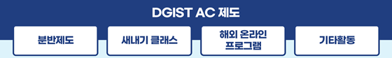 신설된 AC 제도는 기초학부 내 커뮤니티 운영(분반)을 통해 진로탐색과 다양한 활동을 수행하며, 공동체 의식 함양, 풍요로운 학교 생활을 지원하는 제도이다. 분반은 신입생 25명 내외와 지도교수 1~2명, 재학생 PC로 구성된다. 신입생은 ▲교과목(수학, 화학 등) 공동 수강 ▲새내기클래스(디지스트 트랙 소개, 전문가 초청강좌, MT, 체육대회, 간담회 등) 참여 ▲선배와의 활동 참여 등의 활동을 해야 한다. PC는 이 중 교과목 공동 수강 외의 활동에 참여하여, ▲새내기클래스 운영 지원 ▲선배 멘토 역할 수행 등을 수행하고, 분반 활동에 따른 계획서와 결과 보고서 등을 작성해 제출한다.