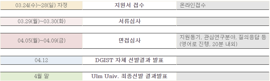 독일 Ulm University로 파견되는 2021 하계 DURA의 참가자를 모집한다. 파견기간은 하계방학 중 6~8주이며, 최대 5인까지 파견한다. 지원 자격은 ▲TOEFL iBT 80점 이상 ▲IELTS 6.0 이상 ▲TOEIC 800점 이상 중 하나라도 만족하는, 파견 시점기준 휴학생을 포함한 기초학부 3~4학년에게 주어진다. 참가하고자 하는 학생은 접수 링크에서 3월 28일 자정까지 지원해야 한다. 제출서류로는 ▲지원서 ▲학업성적증명서 사본 ▲공인어학성적표 사본 ▲글로벌프로그램 개인정보수집이용 동의서가 있다. 선발 일정은 ▲지원서 접수 ▲서류심사 ▲면접심사 ▲DGIST 자체 선발결과 발표 ▲Ulm Univ. 최종선발결과 발표로 진행되며, DGIST 및 파견기관의 사정에 따라 변동될 수 있다.