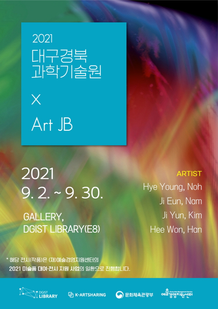 DGIST 학술문화팀은 이달 2일부터 30일까지 약 한 달간 DGIST 학술정보관(E8) 1층 갤러리에서 특별 전시회를 개최한다. 이번 전시회는 문화체육관광부 주최 (재)예술경영지원센터 주관 ‘미술품 대여 · 전시 지원 사업’의 일환으로 개최되며 청년작가 4인(노혜영, 남지은, 김지윤, 한희원)의 작품 17점이 전시된다.
