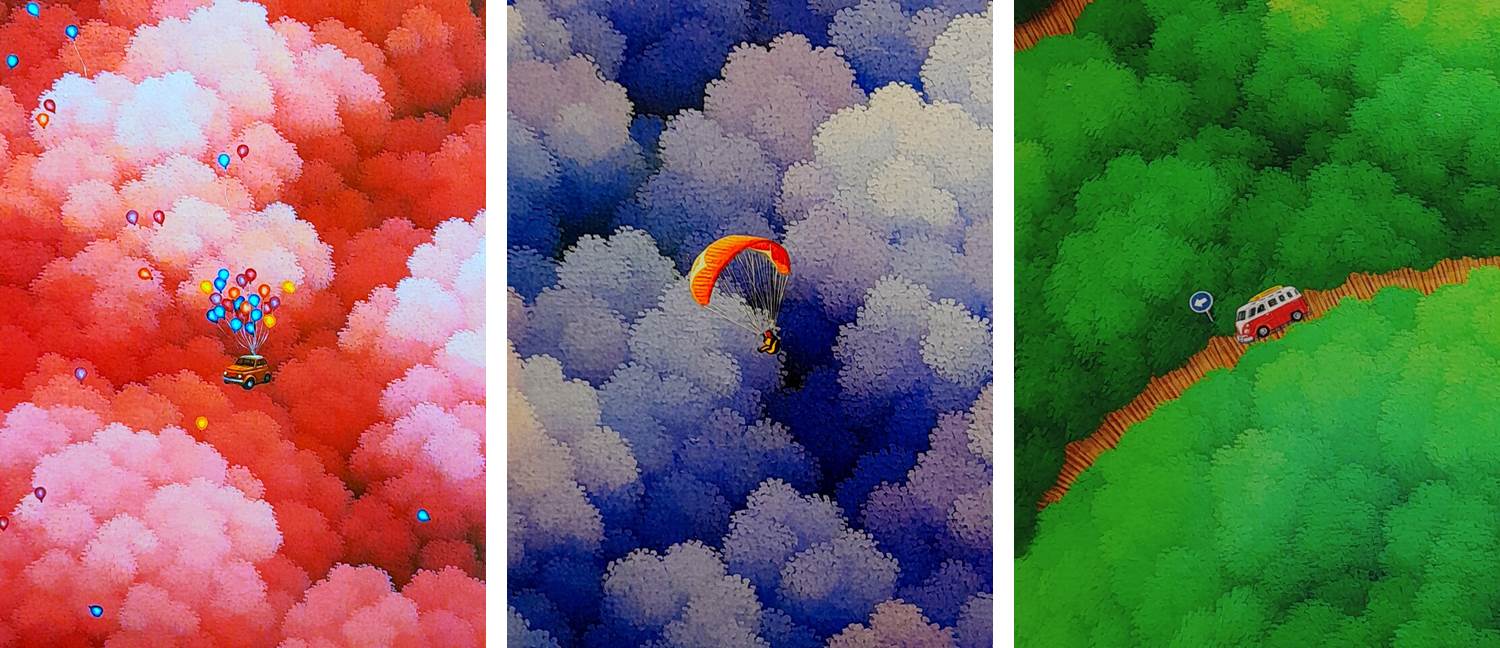 갤러리에 들어서자마자 마주치는 벽에 녹색, 다홍색, 청보라색이 오묘하게 어우러진 신비로운 숲이 걸려있다. 노혜영 작가의 <Fluffy forest> 연작이다. 하얀 벽과 대비되는 강렬한 색감은 시선을 잡아끄는 힘을 지녔다. 멀리서 본 그림은 환상 속에서 본 듯 몽환적이면서도 울창한 숲의 정경을 묘사한다. 그러다 그림에 조금 더 가까이 다가서면 그제서야 색색의 풍선을 단 자동차, 낙하산을 탄 사람들, 소용돌이 모양의 길을 따라 나무 사이를 헤쳐 나아가는 붉은 버스를 보게 된다. 그토록 뚜렷하게 대비되는 색인데도 가까이 다가서기 전까지는 보지 못했다. 그러나 한 번 존재를 인식하고 나면 아무리 멀리서 보아도 숲의 나무들보다 사이사이의 조그마한 자동차와 낙하산이 먼저 눈에 들어온다. 우리의 눈은 나무와 숲을 동시에 보기를 어려워하는 것 같다. 대상을 보는 시야를 달리하면 종종 새로운 것이 눈에 들어오기도 한다.