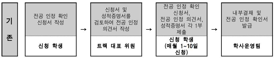 이번 개편을 통해, 14~19학번 학부생 대상 전공 인정서 확인 발급 절차도 간소화되었다. 기존에는 ▲매월 1일에서 10일 사이에 전공 인정 확인 신청서를 작성해 ▲트랙 대표 교원에게 제출하고 ▲전공 인정 의견서를 받은 후 ▲학사운영팀에 성적 증명서와 함께 제출하였다. 그러나 이번 변경안에 따르면, 학부생은 ▲전공 인정 신청서와 성적 증명서를 매월 5일까지 학사 운영팀으로 제출하고 ▲학사 운영팀에서 신청서 및 성적 증명서를 취합해 일괄적으로 각 트랙 대표 교원을 통해 전공 인정 의견서를 받은 후 ▲최종적으로 전공 인정 확인서를 발급한다.
