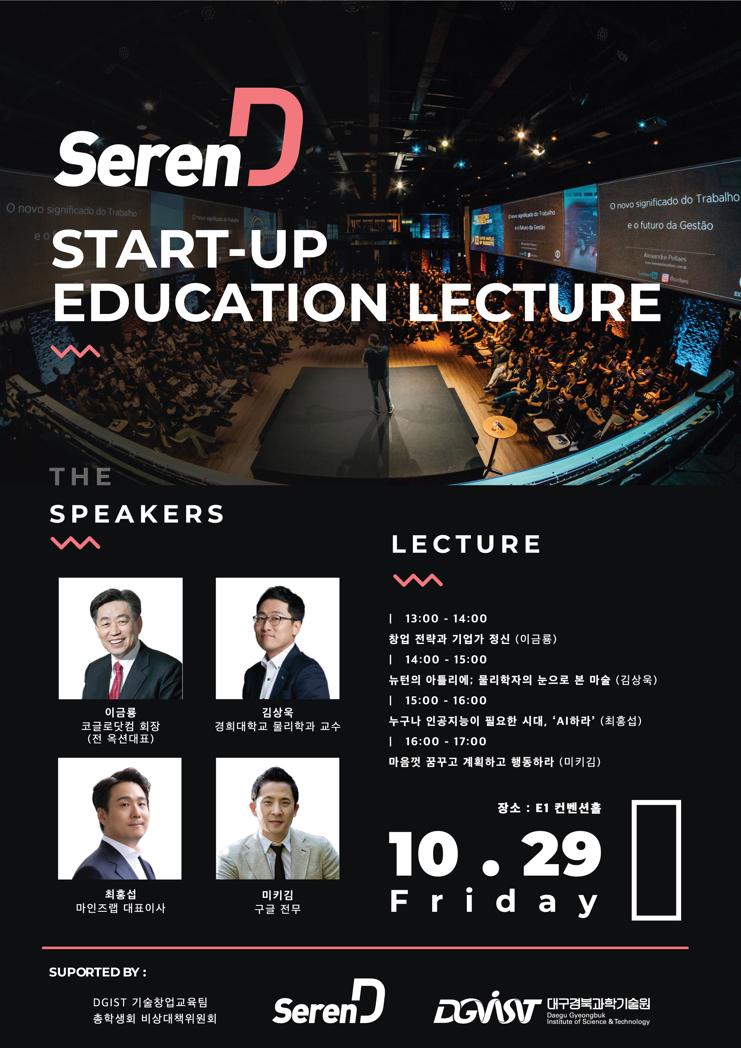 10월 29일, DGIST 기술창업교육팀과 총학생회 비상대책위원회에서 주최한 제2회 Seren D 행사가 대학본부(E1) 컨벤션홀에서 열렸다. 작년과 마찬가지로 학생들이 관심을 두는 ▲창업 ▲과학 ▲예술 ▲사회 분야의 연사를 초빙하여, ▲이금룡 회장(코글로닷컴, 前 옥션 창업자) ▲김상욱 교수(경희대학교 물리학과) ▲최홍섭 대표(마인즈랩) ▲미키김 전무(구글 사업제휴 아시아태평양 총괄)의 강연이 진행되었다.