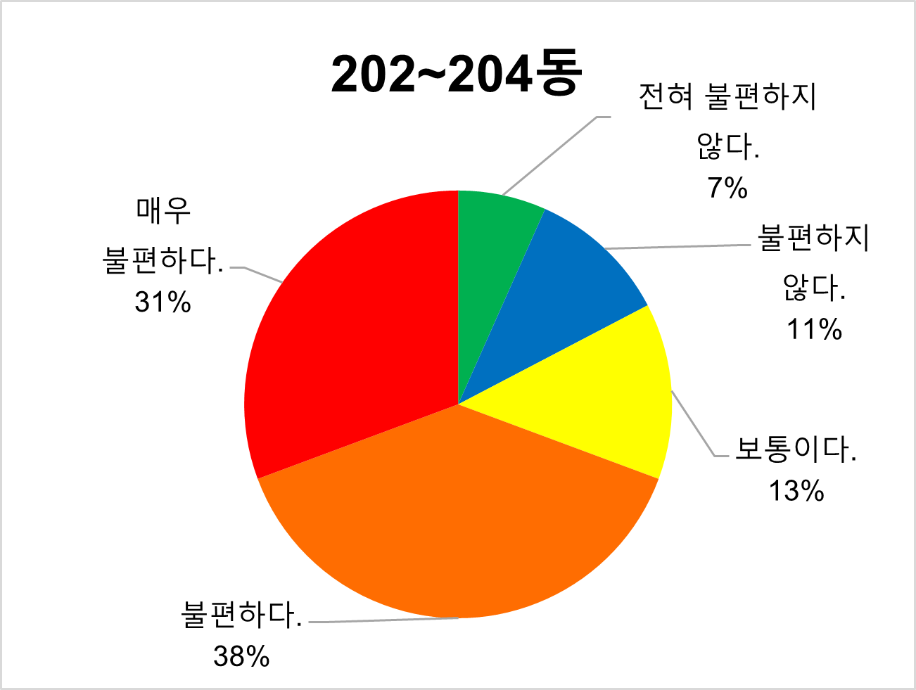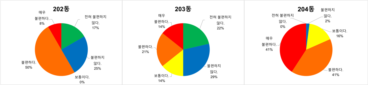 204동은 응답률이 가장 높았던 만큼 불편하다는 의견이 82%로 높았으며, 불편하지 않다는 의견은 2%로 미미한 편이었다. 전혀 불편하지 않다는 의견은 없었다. 세 동 중 중간 위치에 놓인 203동은 불편 정도에 있어 고른 분포를 보이며 불편하지 않다는 의견이 49%를 차지하였다. 반면, 공사장과 가장 멀리 떨어진 202동은 42%가 불편하지 않다고 밝혔다. 응답률과 응답 결과를 고려하면 공사장과 바로 마주하고 있는 204동 학생들이 공사 소음으로 인해 가장 많이 고통받고 있음을 확인할 수 있었다.