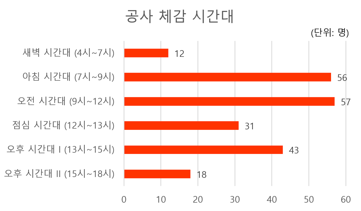 이어 학생들이 공사 소음을 체감하는 시간대를 조사하였다. 주로 수업이 집중된 ▲9시~12시 ▲13시~18시의 일과 시간뿐 아니라, 새벽 시간대와 점심 시간대에도 공사 소음을 느꼈다는 응답이 있었다. 소음을 체감하는 학생이 많은 시간대는 주로 오전 시간대로, 기숙사에서는 비대면 오전 수업을 듣기 어려워 공사 소음 때문에 방을 나선다는 의견도 존재했다. 일부 학생은 아침 시간대 공사 소음으로 수면의 질이 떨어졌다고 토로하기도 했다.
