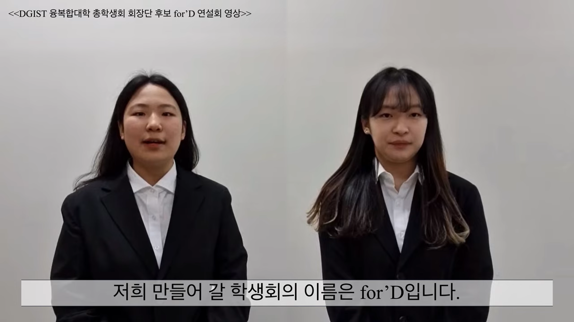 임수진 정후보(이하 임 정후보)와 손아영 부후보(이하 손 부후보)는 총학생회 회장단 후보 명칭 for’D가 ‘DGIST인들을 위하여’와 ‘앞으로 나아가다’를 뜻하는 ‘forward’를 내포하며 DGIST를 위해 앞장서서 나아가겠다는 포부를 담았다고 밝혔다.