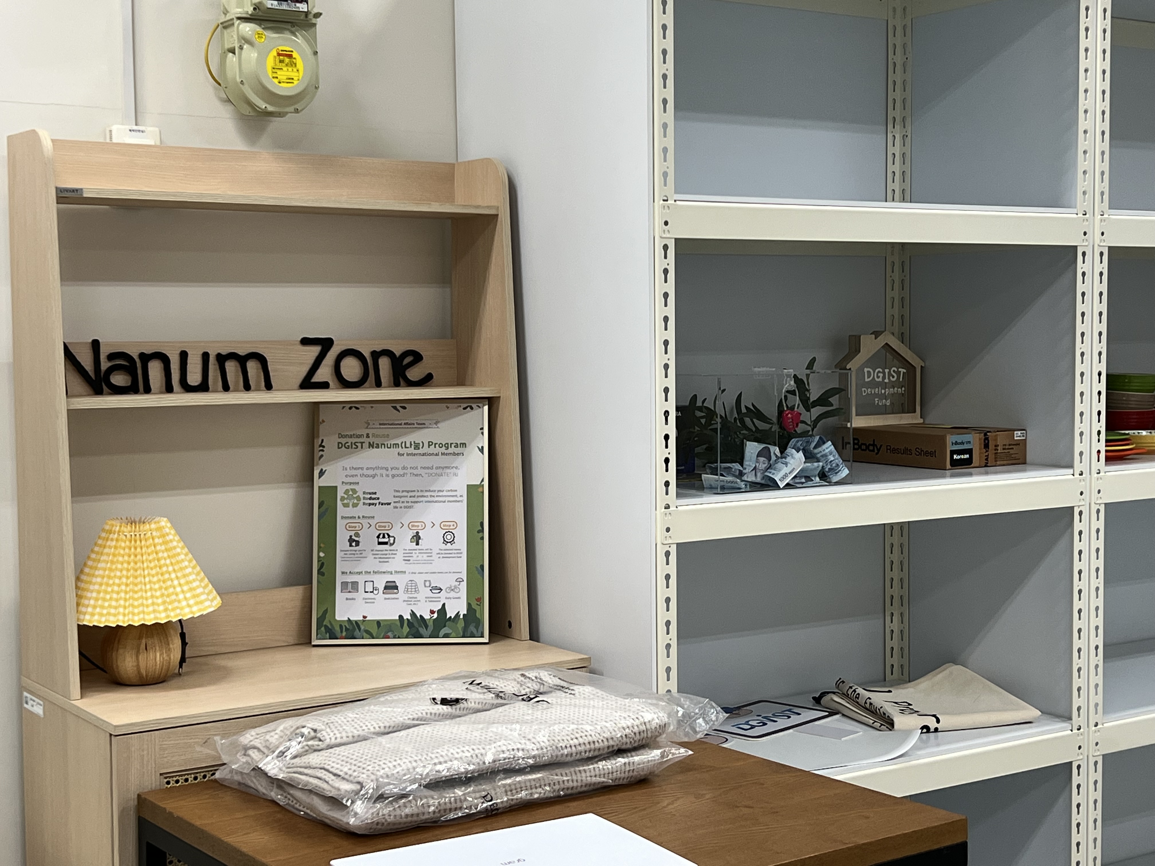 글로벌 라운지에 들어오면 바로 왼쪽 방에 나눔 존(Nanum Zone)이 있다. 나눔 존은 현재 코로나19로 인한 물품 소독 등의 사유로 운영이 중단되었다. 국제협력센터는 코로나19 완화 상황에 따라 현재 나눔 존 개관식에 박차를 가하고 있다고 전했다. 사용하지 않는 책, 전자기기, 침구류, 의류, 생활용품 등을 이곳에 기부할 수 있다. 기부된 물품은 구매자가 원하는 만큼 돈을 자유롭게 지불하고 가져간다. 모인 판매금은 DGIST 발전기금으로 사용된다.