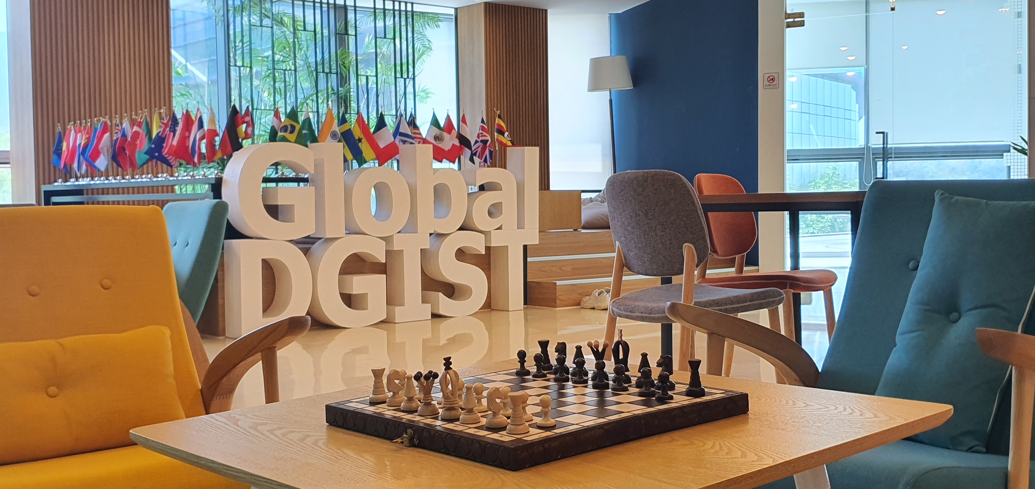 글로벌 라운지에 마련된 체스판과 서적은 국제 학생과의 교류에 사용할 수 있다. 글로벌 라운지 한가운데를 차지한 Global DGIST에는 각국의 국기가 놓여 있다. 국기 뒤에는 휴식을 위한 소파와 테이블이 있다.