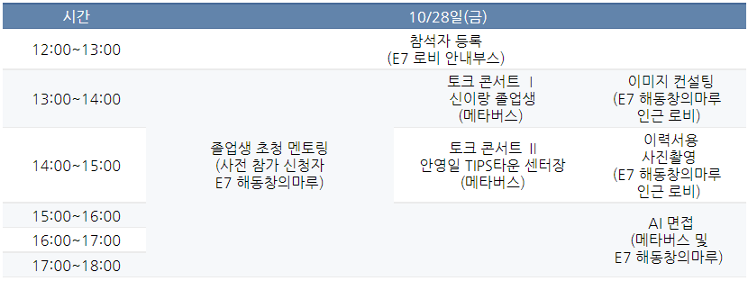 행사는 10월 28일 12시부터 18시까지 E7 해동창의마루 및 인근 로비에서 진행된다. 세부 일정은 다음과 같다.
