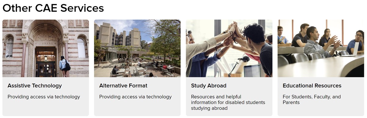UCLA에는 영구적, 일시적인 신체 및 정신적 장애 또는 학습에 어려움을 가진 학생들을 위한 다양한 제도 운용을 전담하는 CAE(center for accessibility education)라는 부서가 있었다. 부서 구성원 또한 24년 1월 기준 31명으로 많았으며, 첫 신청 시에 담당자가 배정되어, 담당자와 지속적해서 상호작용하며 필요한 도움을 받을 수 있는 시스템이다. 다양한 장애 유형에 맞춰서 시스템이 체계적으로 구축되어 있었으며, 개개인의 상태에 맞춰 필요한 서비스나 도움을 선택, 요청하여 받을 수 있었다.