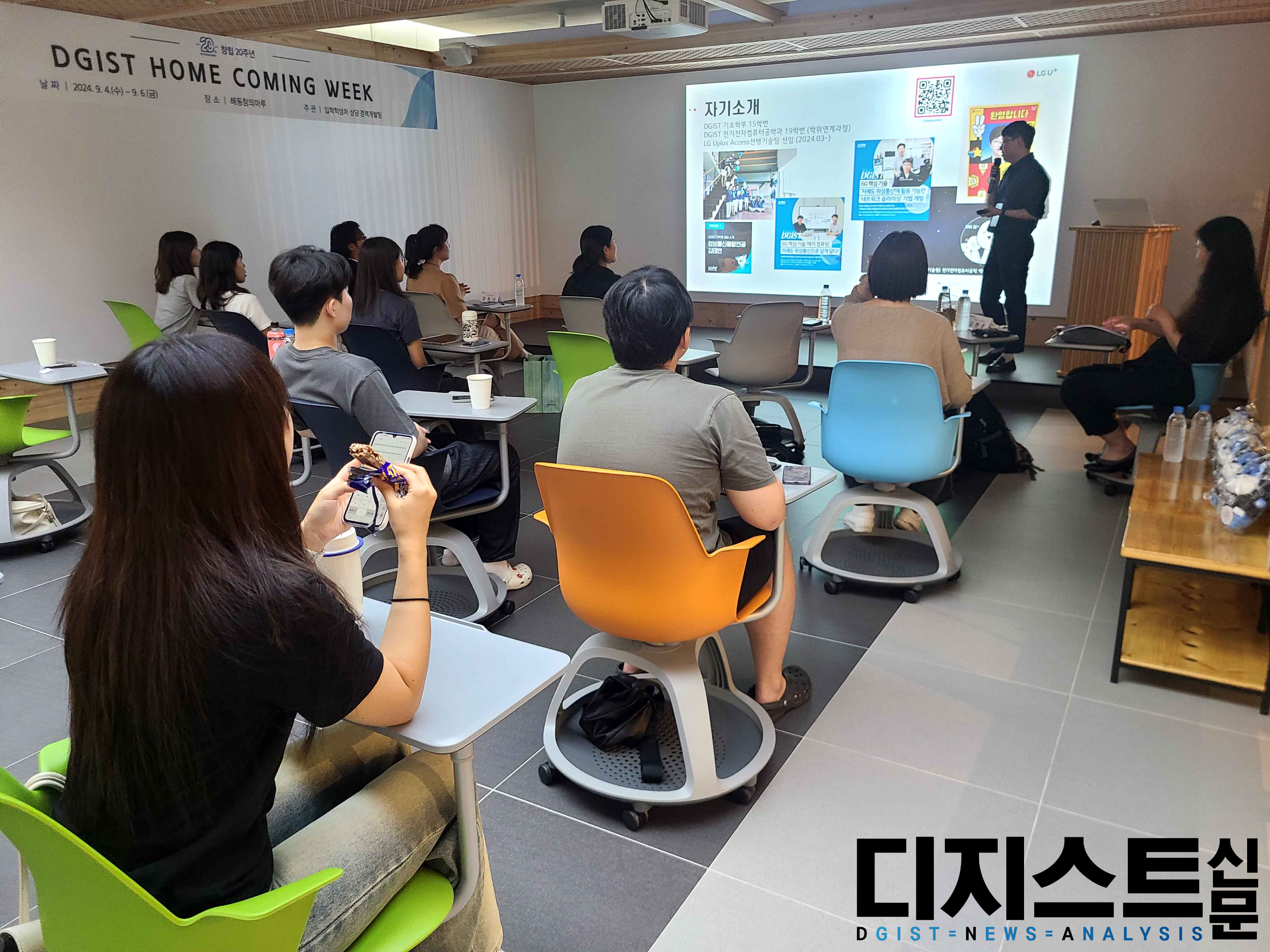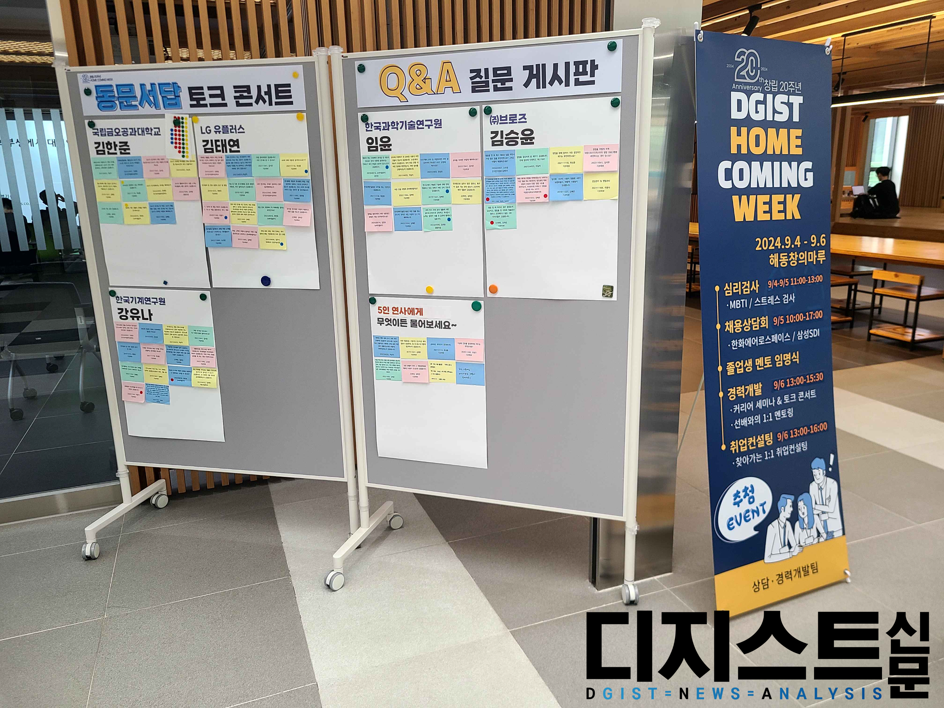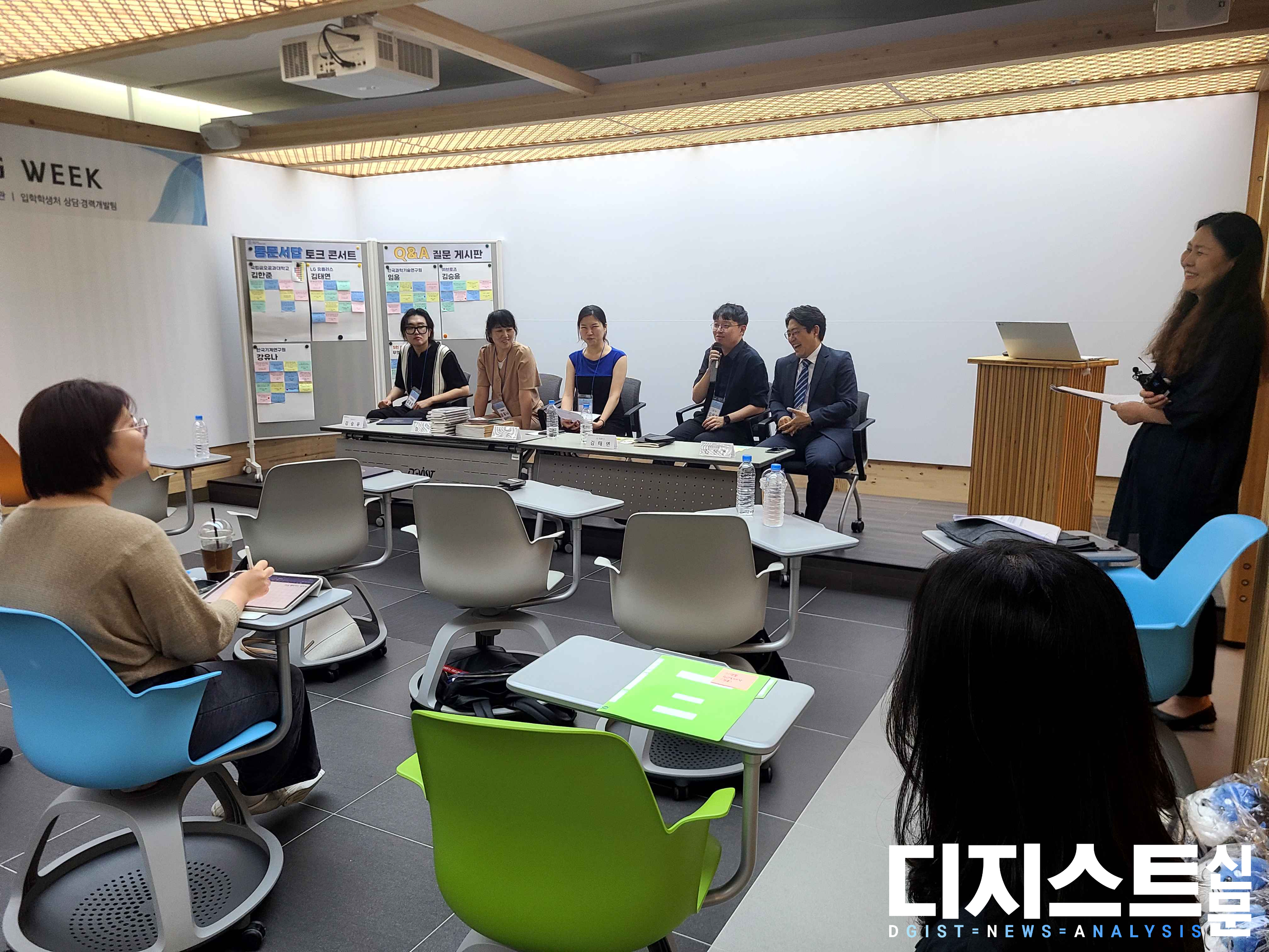 지난 9월 6일, 해동창의마루에서 DGIST 20주년 Home coming week의 일환으로 동문서답 (동문에게 묻고 서로에게 답하다) 토크콘서트가 열렸다. 강연자로 ▲김한준 국립금오공과대학교 교수 (전기전자컴퓨터공학과 `13, 현 DGIST 총동문회 회장, 이하 김 교수) ▲임윤 한국과학기술연구원 박사후연구원(뇌과학과 `13, 이하 임 박사) ▲강유나 한국기계연구원 연구원(로봇및기계전자공학과 `12, 이하 강 연구원) ▲김태연 LG 유플러스 연구원(기초학부 15학번, 전지전자컴퓨터공학과 `19, 이하 김 연구원) ▲김승윤 (주)브로즈 대표(기초학부 `16, 이하 김 대표)가 참석하였다.