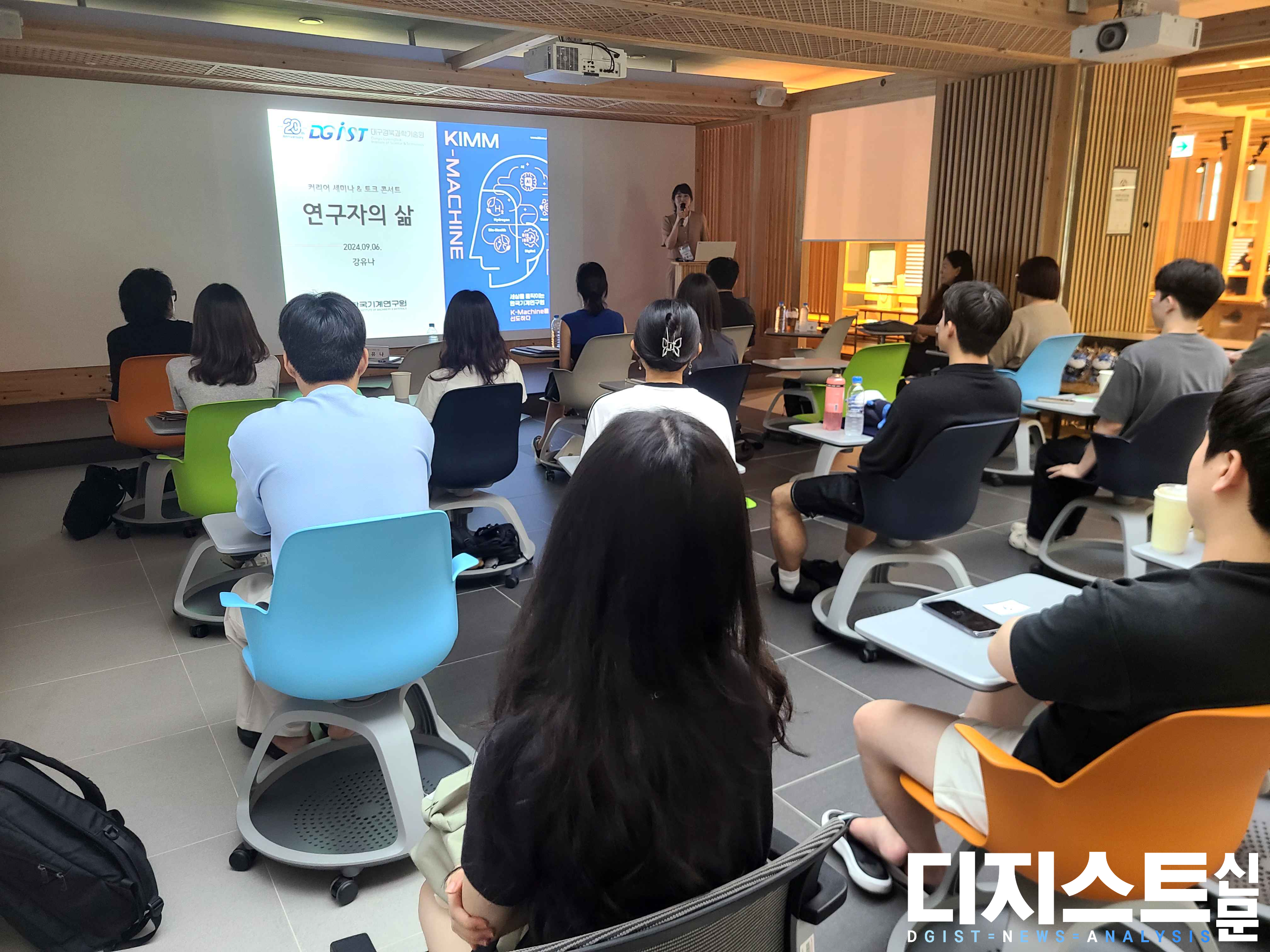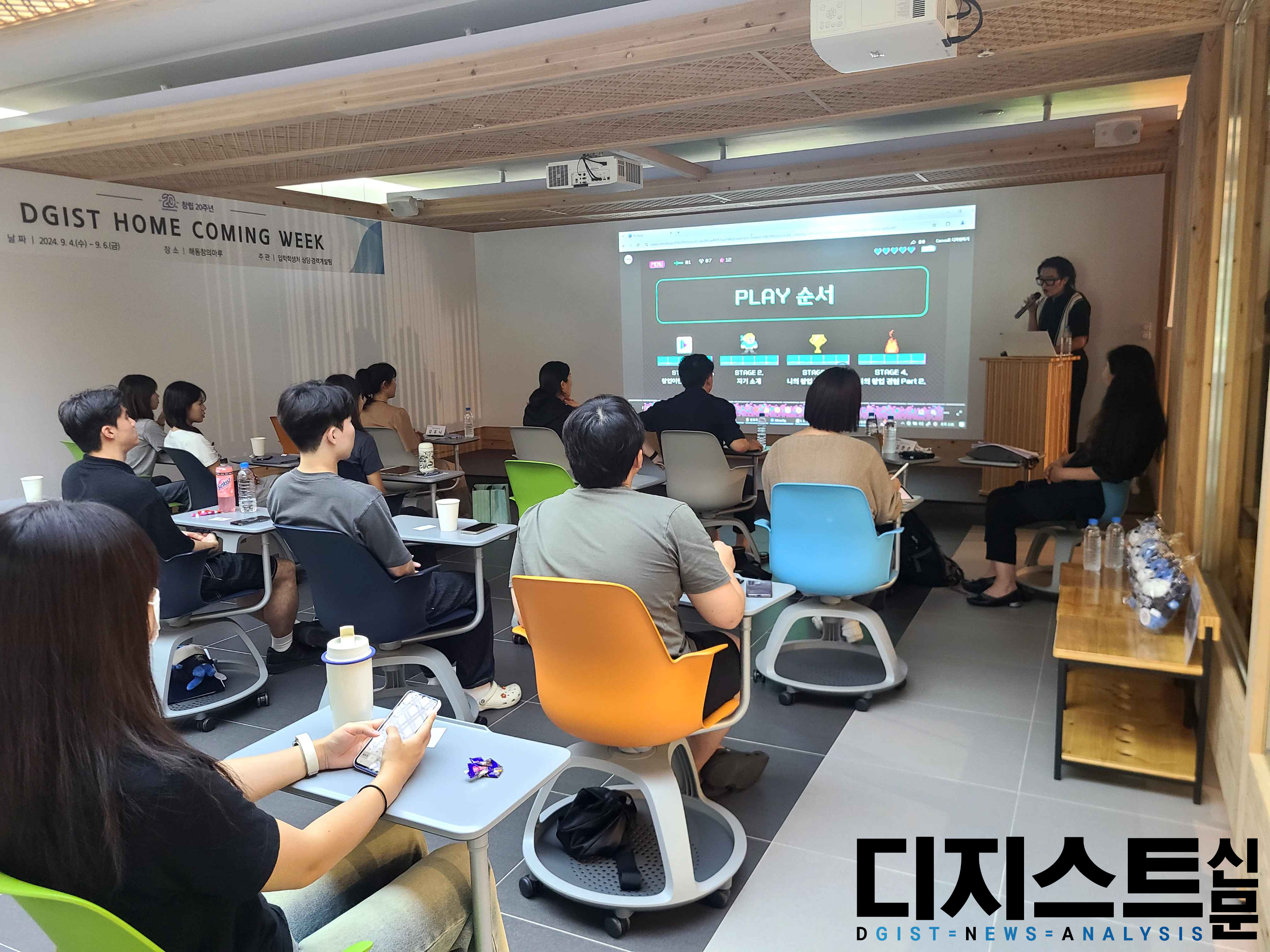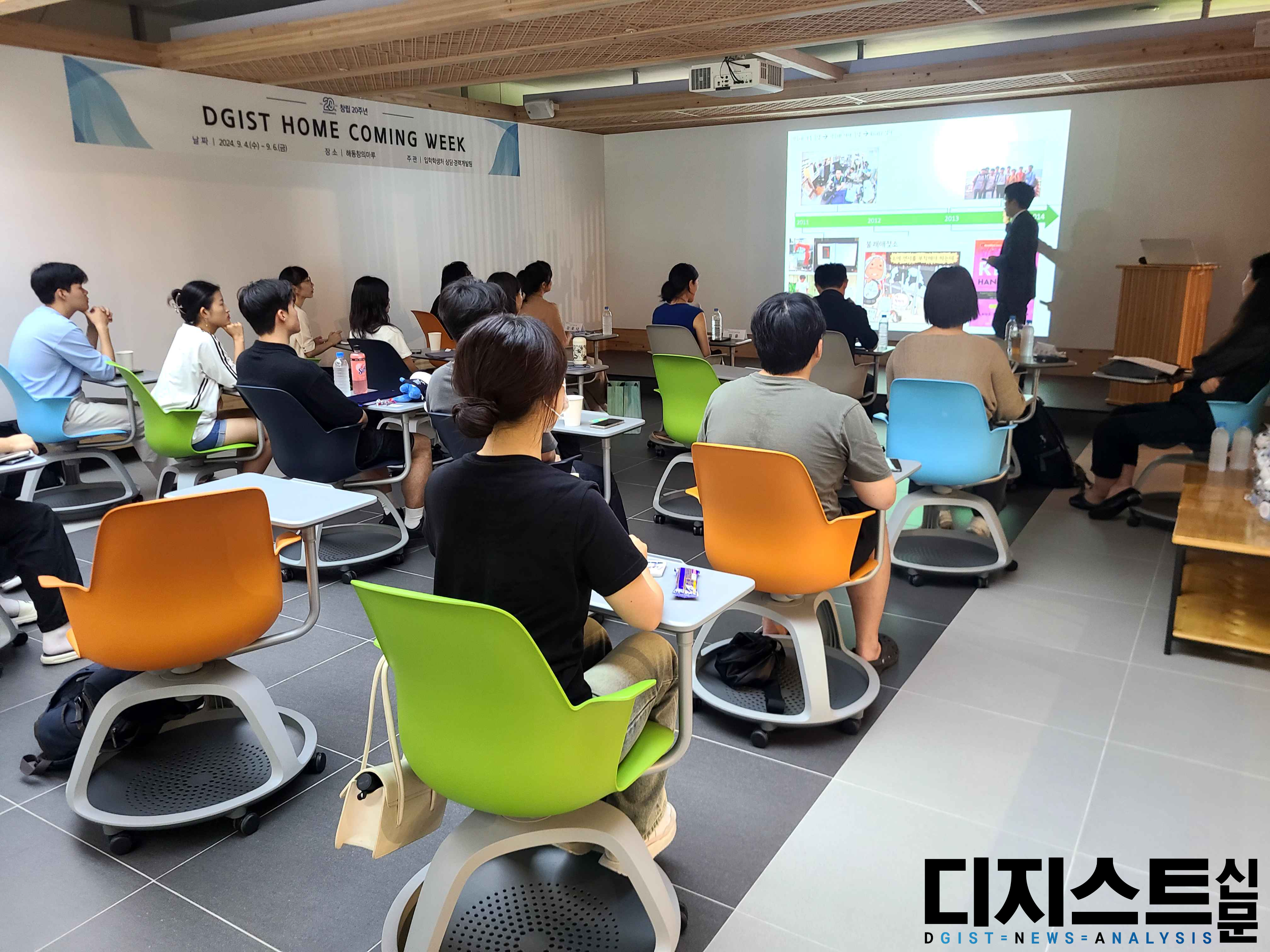 지난 9월 6일, 해동창의마루에서 DGIST 20주년 Home coming week의 일환으로 동문서답 (동문에게 묻고 서로에게 답하다) 토크콘서트가 열렸다. 강연자로 ▲김한준 국립금오공과대학교 교수 (전기전자컴퓨터공학과 `13, 현 DGIST 총동문회 회장, 이하 김 교수) ▲임윤 한국과학기술연구원 박사후연구원(뇌과학과 `13, 이하 임 박사) ▲강유나 한국기계연구원 연구원(로봇및기계전자공학과 `12, 이하 강 연구원) ▲김태연 LG 유플러스 연구원(기초학부 15학번, 전지전자컴퓨터공학과 `19, 이하 김 연구원) ▲김승윤 (주)브로즈 대표(기초학부 `16, 이하 김 대표)가 참석하였다.
