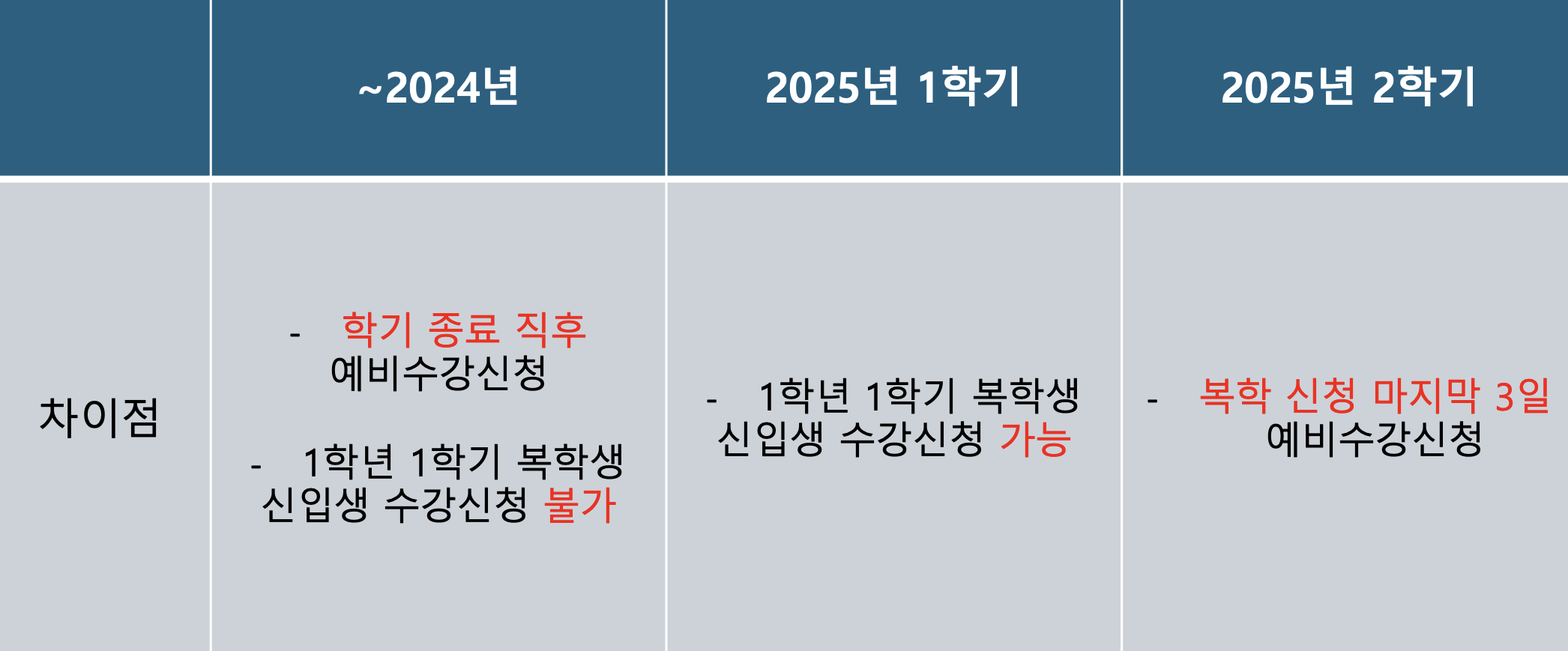 이후 <디지스트신문 DNA>는 학사팀을 만나 2025년도 수강신청에 어떤 점이 바뀔지에 대해 물었다. 우선 학사팀은 다음학기 학사일정은 이미 결재가 완료되어 학사일정을 당장 변경하기는 어려우나, 2025학년도 2학기 예비수강신청 일자를 미루기로 했다고 답했다. 복학생이 예비수강신청이 가능하도록, 복학신청 2주 중 마지막 3일 정도의 기간을 예비수강신청 기간으로 잡기로 한 것이다. 이에 따라 성적 확인 이후 예비수강신청을 하기 때문에, 선수과목이 필요한 교과목도 예비수강신청이 가능해진다. 학사팀은 “실질적으로 해당기간이 짧아 예비수강신청 결과로 큰 변화가 일어나긴 어렵다. 하지만 좀 더 현실적인 인원을 반영하여, 해당 결과를 통해 교수님들과 1차적으로 협의가 가능할 것 같다.”라고 전했다.