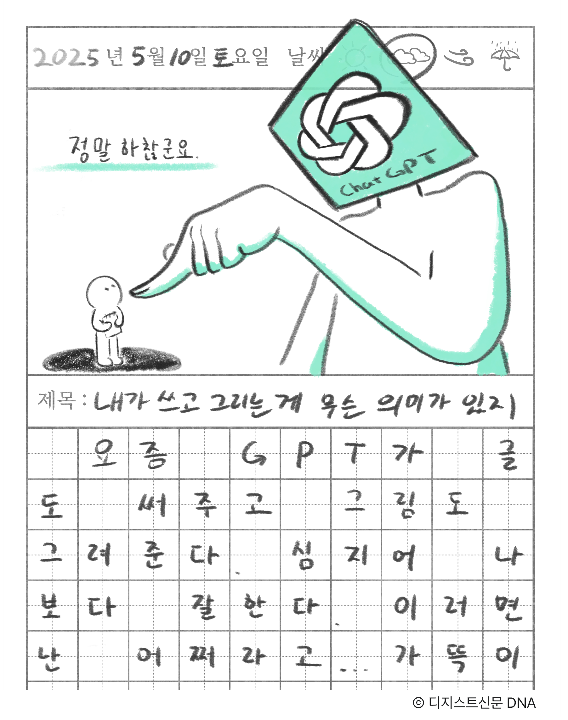 하물며 이제는 사람만이 개인의 비교 대상이 아니다. 인공지능까지 경쟁 상대로 투입되었다. 인간 실력자는 일을 시키는 데에 시간과 돈이라도 들지! ChatGPT는 말만 하면 순식간에 글을 써주고, 그림을 그려주고, 지브리 프로필 사진도 만들어준다. 기사에 넣을 삽화가 필요할 때면 이전엔 내가 직접 그리곤 했으나, 지금은 AI에 시키는 게 더 효율이 높다. 글을 쓰며 문장 하나가 매끄럽지 않을 때도, 머리를 쥐어짜며 고친 문장보다 AI가 추천해 준 게 훨씬 나을 때가 많다. 취미 생활과 기자 생활로 쌓아 올린 능력을 ‘딸깍’ 한 번에 대체할 수 있다. 이런 세상에서 스스로 그리고 쓰는 게 어떤 의미 있을까?