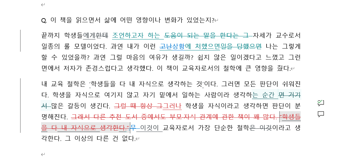 고백하자면, 필자의 교열은 글을 거의 난도질해 놓는 수준이다. 교열팀 내에서도 성향이 다양해서 극도로 조심스러운 유형이 있는가 하면 (이 경우 글을 직접 고치는 것도 꺼려서 대부분 제안만 달아둔다) 상당히 과격한 유형도 있는데, 필자는 교열의 과격함으로는 세 손가락 안에 들 것이다. 수정 전을 알아볼 수 있게 ‘변경 내용 추적’을 켜두고 글을 고치다 보면 수정사항으로 본문이 알록달록해진다. 저 많은 수정사항을 확인해야 할 기자에게 미안할 지경이다.